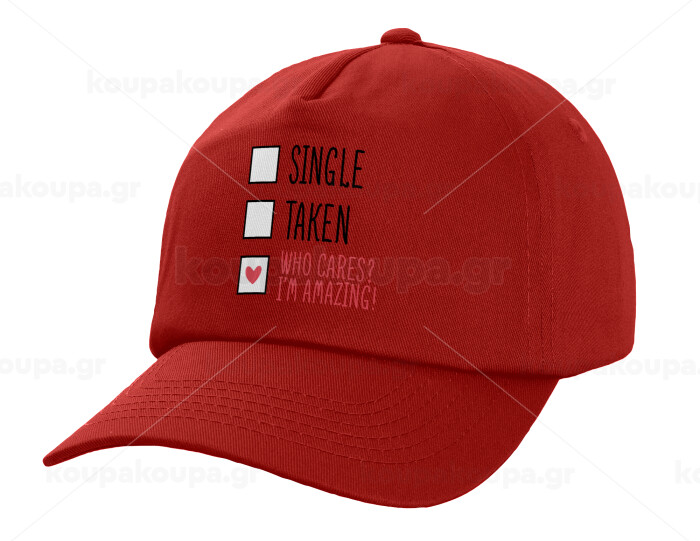 Single, Taken, Who cares i'm amazing, Καπέλο παιδικό Baseball, 100% Βαμβακερό Twill, Κόκκινο (ΒΑΜΒΑΚΕΡΟ, ΠΑΙΔΙΚΟ, UNISEX, ONE SIZE)
