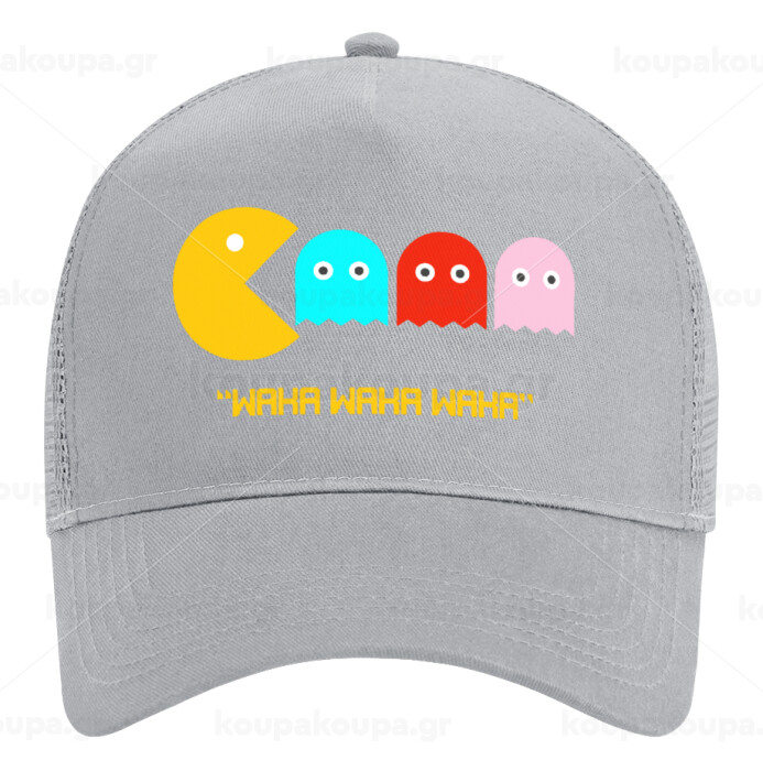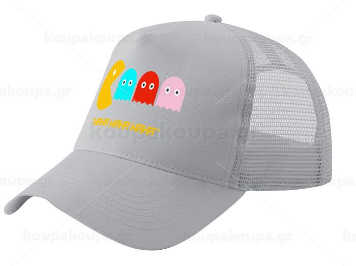 Pacman waka waka waka, Καπέλο Trucker με Δίχτυ, ΓΚΡΙ, (ΒΑΜΒΑΚΕΡΟ, ΠΑΙΔΙΚΟ, UNISEX, ONE SIZE)