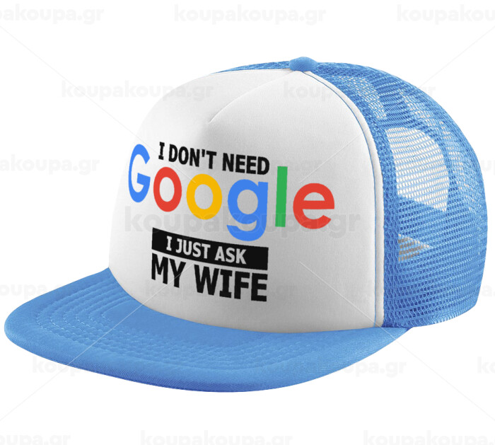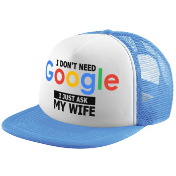 I don't need Google, just ask my WIFE, Καπέλο παιδικό Soft Trucker με Δίχτυ ΓΑΛΑΖΙΟ/ΛΕΥΚΟ (POLYESTER, ΠΑΙΔΙΚΟ, ONE SIZE)