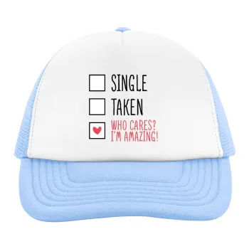 Single, Taken, Who cares i'm amazing, Καπέλο παιδικό Soft Trucker με Δίχτυ ΓΑΛΑΖΙΟ/ΛΕΥΚΟ (POLYESTER, ΠΑΙΔΙΚΟ, ONE SIZE)