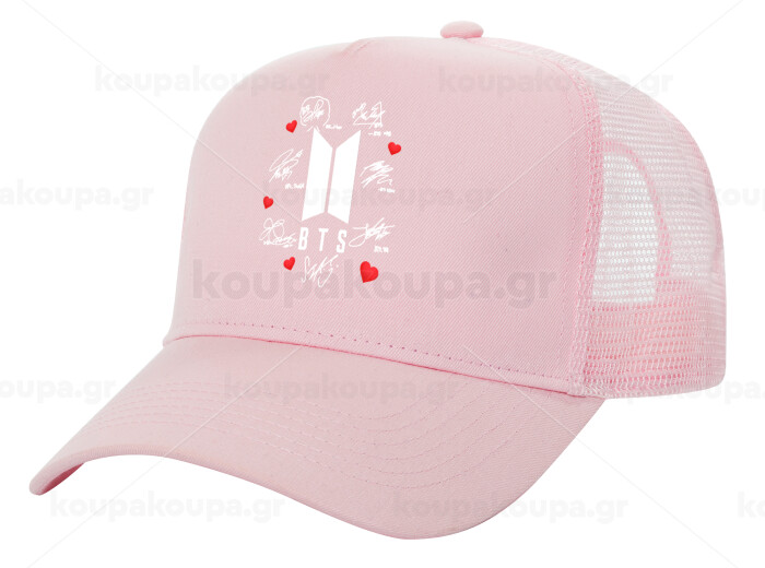 BTS signs, Καπέλο Παιδικό Structured Trucker, με Δίχτυ, ΡΟΖ (100% ΒΑΜΒΑΚΕΡΟ, ΠΑΙΔΙΚΟ, UNISEX, ONE SIZE)