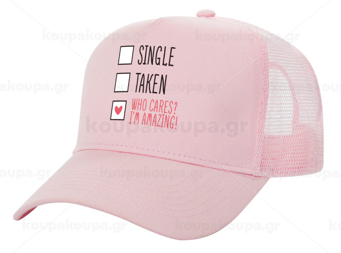 Single, Taken, Who cares i'm amazing, Καπέλο Παιδικό Structured Trucker, με Δίχτυ, ΡΟΖ (100% ΒΑΜΒΑΚΕΡΟ, ΠΑΙΔΙΚΟ, UNISEX, ONE SIZE)