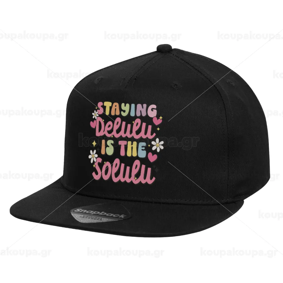 Delulu, Καπέλο παιδικό Flat Snapback, Μαύρο (100% ΒΑΜΒΑΚΕΡΟ, ΠΑΙΔΙΚΟ, UNISEX, ONE SIZE)