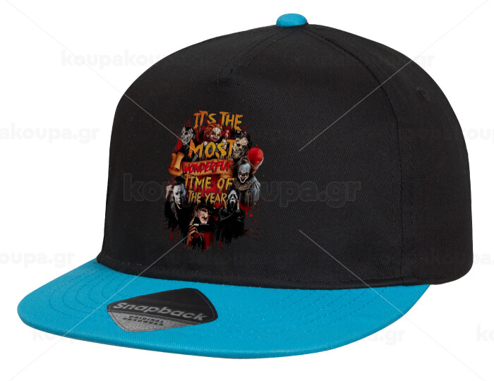 Halloween it's most wonderful time of the year, Καπέλο παιδικό Flat Snapback, Μαύρο/Μπλε (100% ΒΑΜΒΑΚΕΡΟ, ΠΑΙΔΙΚΟ, UNISEX, ONE SIZE)