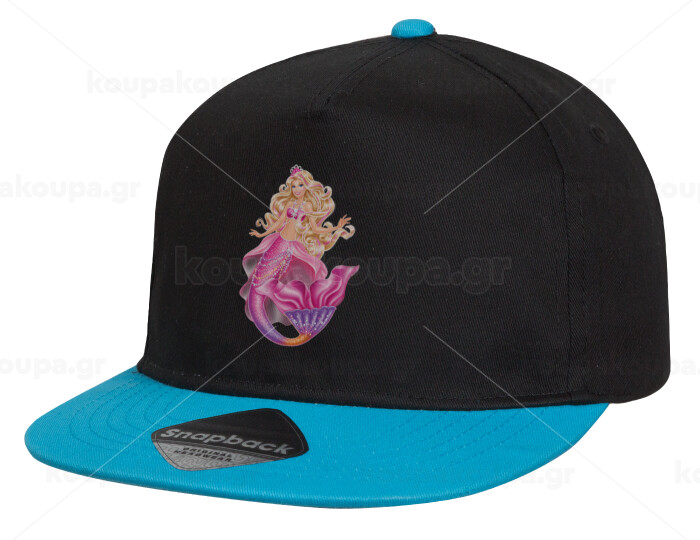 Barbie γοργόνα μπλε, Καπέλο παιδικό Flat Snapback, Μαύρο/Μπλε (100% ΒΑΜΒΑΚΕΡΟ, ΠΑΙΔΙΚΟ, UNISEX, ONE SIZE)