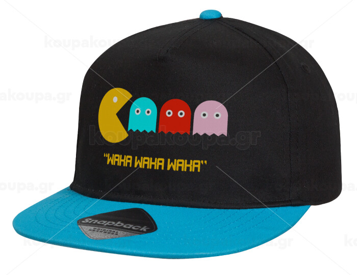 Pacman waka waka waka, Καπέλο παιδικό Flat Snapback, Μαύρο/Μπλε (100% ΒΑΜΒΑΚΕΡΟ, ΠΑΙΔΙΚΟ, UNISEX, ONE SIZE)