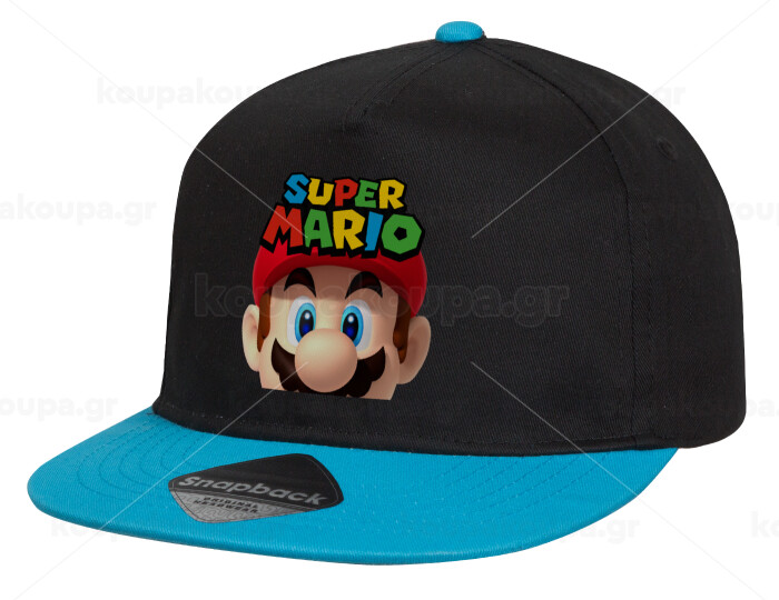 Super mario, Καπέλο παιδικό Flat Snapback, Μαύρο/Μπλε (100% ΒΑΜΒΑΚΕΡΟ, ΠΑΙΔΙΚΟ, UNISEX, ONE SIZE)