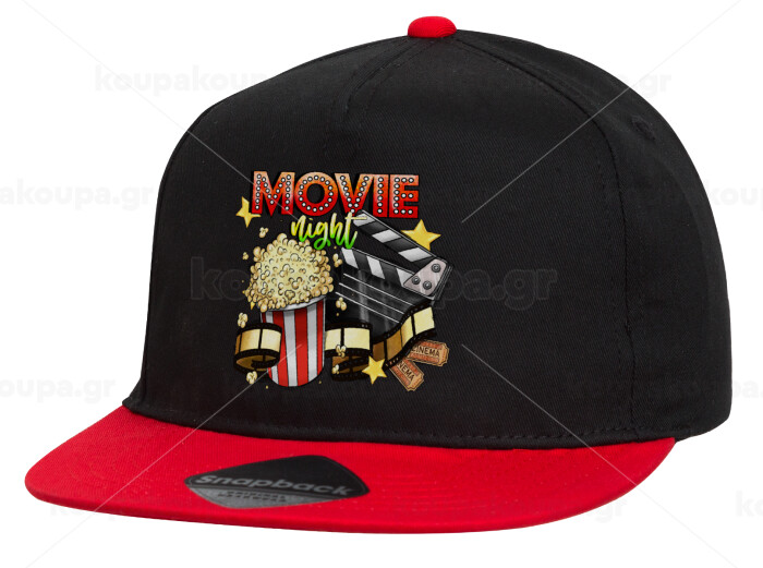Movie night, Καπέλο παιδικό Flat Snapback, Μαύρο/Κόκκινο (100% ΒΑΜΒΑΚΕΡΟ, ΠΑΙΔΙΚΟ, UNISEX, ONE SIZE)