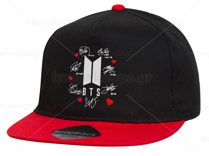 BTS signs, Καπέλο παιδικό Flat Snapback, Μαύρο/Κόκκινο (100% ΒΑΜΒΑΚΕΡΟ, ΠΑΙΔΙΚΟ, UNISEX, ONE SIZE)