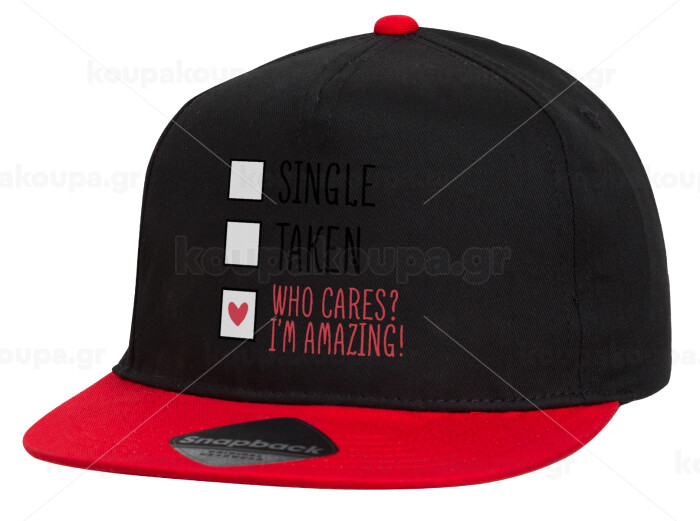 Single, Taken, Who cares i'm amazing, Καπέλο παιδικό Flat Snapback, Μαύρο/Κόκκινο (100% ΒΑΜΒΑΚΕΡΟ, ΠΑΙΔΙΚΟ, UNISEX, ONE SIZE)