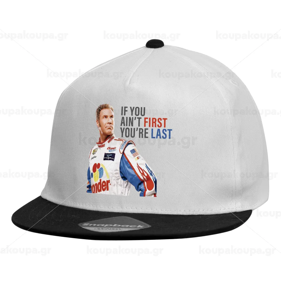 If You Ain't First You're Last Ricky Bobby, Talladega Nights, Καπέλο παιδικό Flat Snapback, Λευκό (100% ΒΑΜΒΑΚΕΡΟ, ΠΑΙΔΙΚΟ, UNISEX, ONE SIZE)