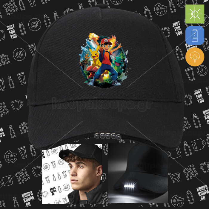 Ash Ketchum & Pikachu, Καπέλο Εργασίας & Δραστηριοτήτων με LED Φως - Ιδανικό για Νύχτα & Χαμηλό Φωτισμό (100% ΒΑΜΒΑΚΕΡΟ, ΕΝΗΛΙΚΩΝ, UNISEX)