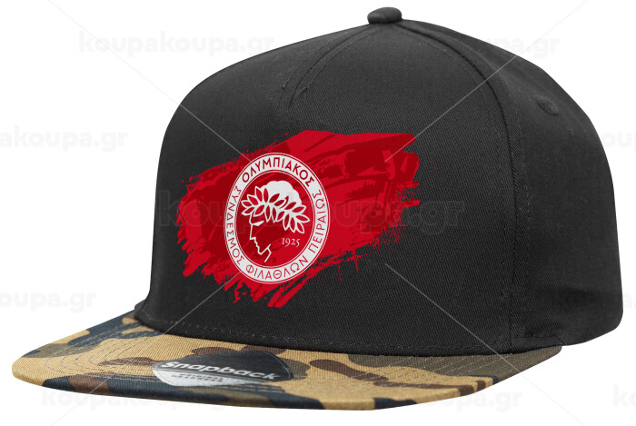Olympiacos F.C., Καπέλο Ενηλίκων Flat Snapback Μαύρο/Παραλλαγή, (100% ΒΑΜΒΑΚΕΡΟ TWILL, ΕΝΗΛΙΚΩΝ, UNISEX, ONE SIZE)