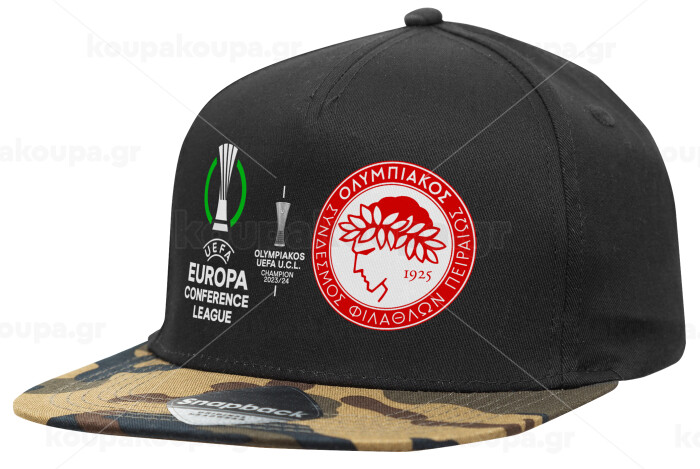 Ολυμπιακός νικητής UEFA Europa Conference League Champion 2023/24, Καπέλο Ενηλίκων Flat Snapback Μαύρο/Παραλλαγή, (100% ΒΑΜΒΑΚΕΡΟ TWILL, ΕΝΗΛΙΚΩΝ, UNISEX, ONE SIZE)