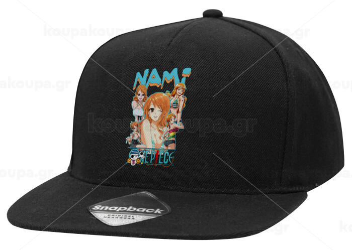 Nami One Piece, Καπέλο Ενηλίκων Flat Snapback Μαύρο, (100% ΒΑΜΒΑΚΕΡΟ TWILL, ΕΝΗΛΙΚΩΝ, UNISEX, ONE SIZE)