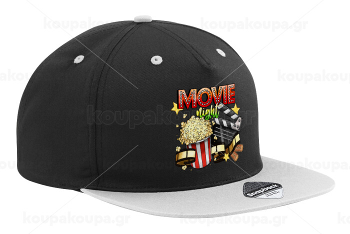 Movie night, Καπέλο Ενηλίκων Flat Snapback Μαύρο/Γκρι, (100% ΒΑΜΒΑΚΕΡΟ TWILL, ΕΝΗΛΙΚΩΝ, UNISEX, ONE SIZE)