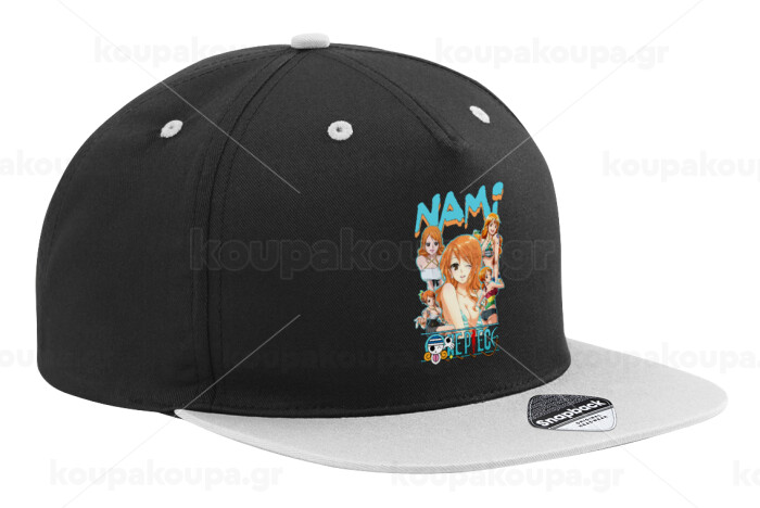 Nami One Piece, Καπέλο Ενηλίκων Flat Snapback Μαύρο/Γκρι, (100% ΒΑΜΒΑΚΕΡΟ TWILL, ΕΝΗΛΙΚΩΝ, UNISEX, ONE SIZE)
