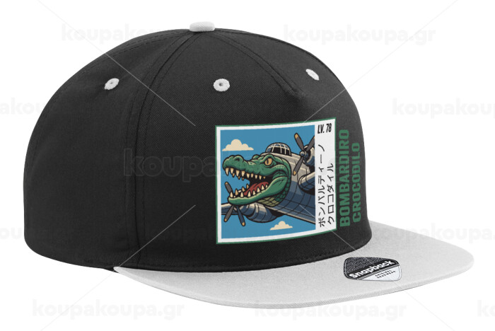 Bombardiro Crocodilo, Καπέλο Ενηλίκων Flat Snapback Μαύρο/Γκρι, (100% ΒΑΜΒΑΚΕΡΟ TWILL, ΕΝΗΛΙΚΩΝ, UNISEX, ONE SIZE)
