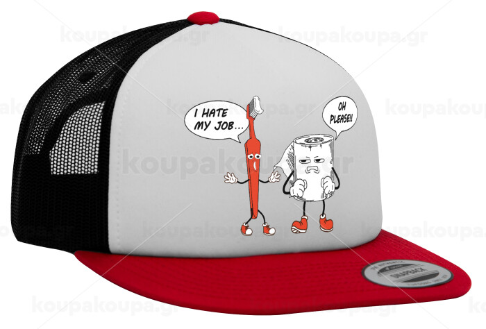 I hate my job, Καπέλο Ενηλίκων Foam Flat Snapback με Δίχτυ Κόκκινο-Λευκό-Μαύρο (POLYESTER, ΕΝΗΛΙΚΩΝ, UNISEX, ONE SIZE)
