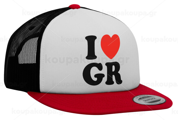 I Love GR, Καπέλο Ενηλίκων Foam Flat Snapback με Δίχτυ Κόκκινο-Λευκό-Μαύρο (POLYESTER, ΕΝΗΛΙΚΩΝ, UNISEX, ONE SIZE)
