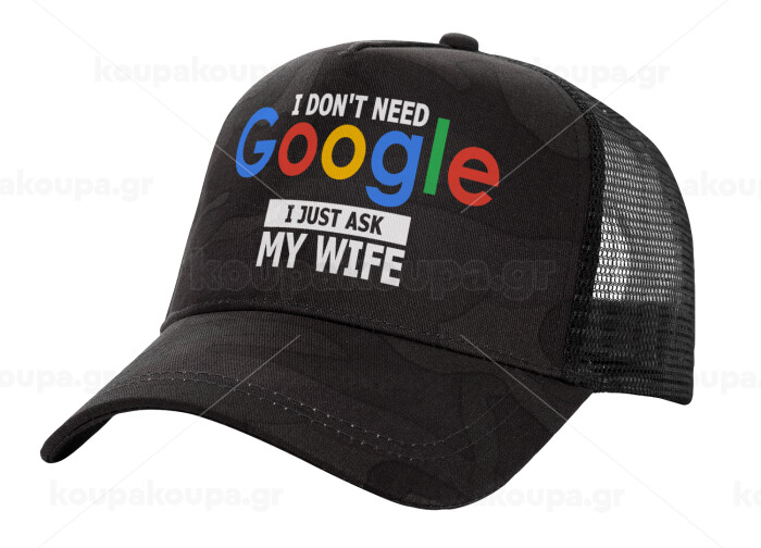 I don't need Google, just ask my WIFE, Καπέλο Ενηλίκων Structured Trucker, με Δίχτυ, (παραλλαγή) Army σκούρο (100% ΒΑΜΒΑΚΕΡΟ, ΕΝΗΛΙΚΩΝ, UNISEX, ONE SIZE)