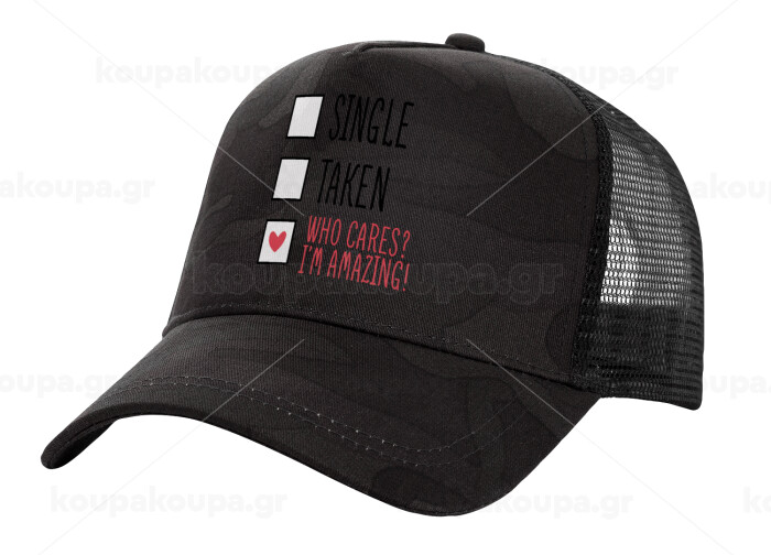 Single, Taken, Who cares i'm amazing, Καπέλο Ενηλίκων Structured Trucker, με Δίχτυ, (παραλλαγή) Army σκούρο (100% ΒΑΜΒΑΚΕΡΟ, ΕΝΗΛΙΚΩΝ, UNISEX, ONE SIZE)