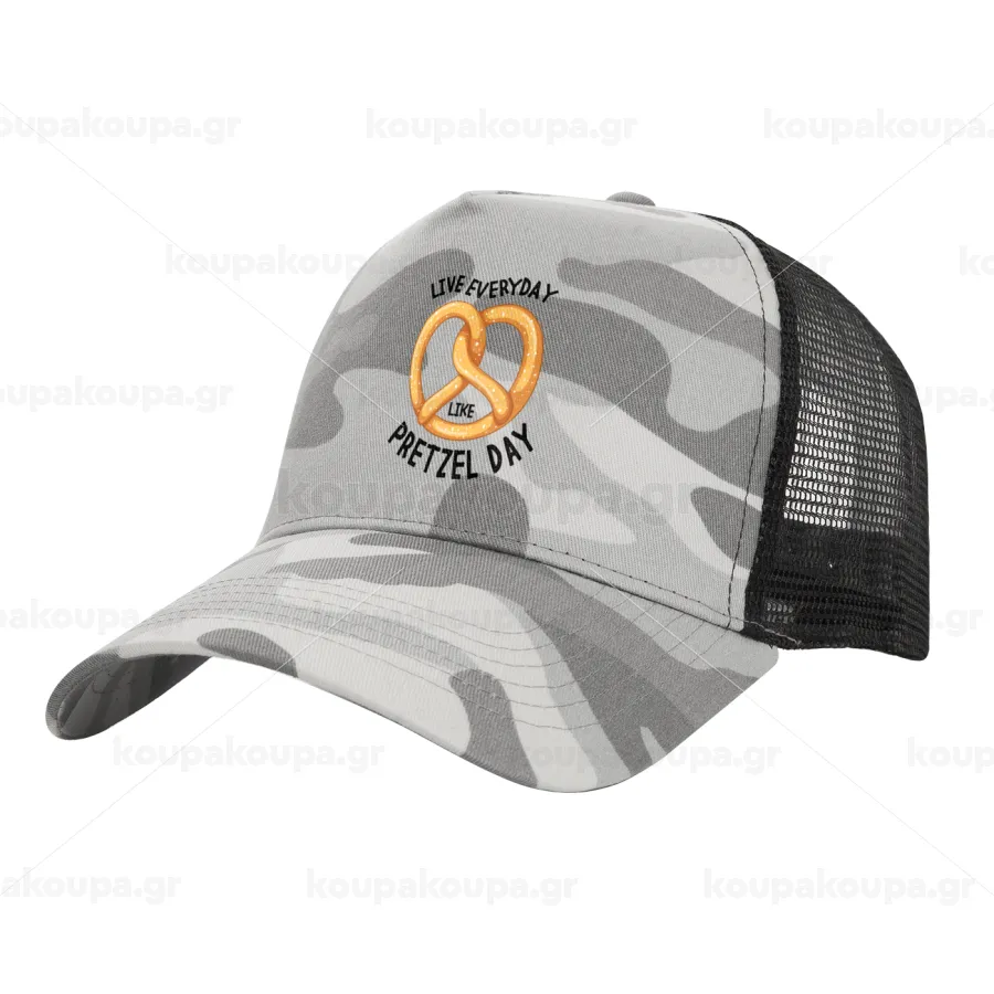 The office, Live every day like pretzel day, Καπέλο Ενηλίκων Structured Trucker, με Δίχτυ, (παραλλαγή) Army Camo (100% ΒΑΜΒΑΚΕΡΟ, ΕΝΗΛΙΚΩΝ, UNISEX, ONE SIZE)