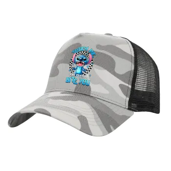 Stitch Touch Me And I Will Bite You, Καπέλο Ενηλίκων Structured Trucker, με Δίχτυ, (παραλλαγή) Army Camo (100% ΒΑΜΒΑΚΕΡΟ, ΕΝΗΛΙΚΩΝ, UNISEX, ONE SIZE)