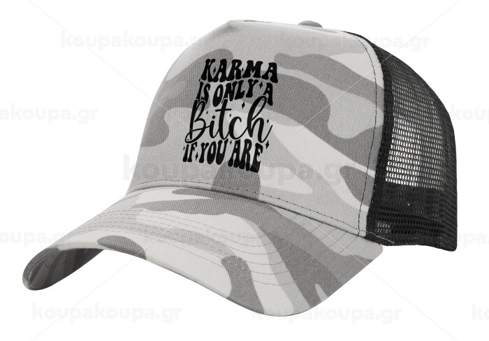 Karma is Only A Bitch if You Are, Καπέλο Ενηλίκων Structured Trucker, με Δίχτυ, (παραλλαγή) Army Camo (100% ΒΑΜΒΑΚΕΡΟ, ΕΝΗΛΙΚΩΝ, UNISEX, ONE SIZE)