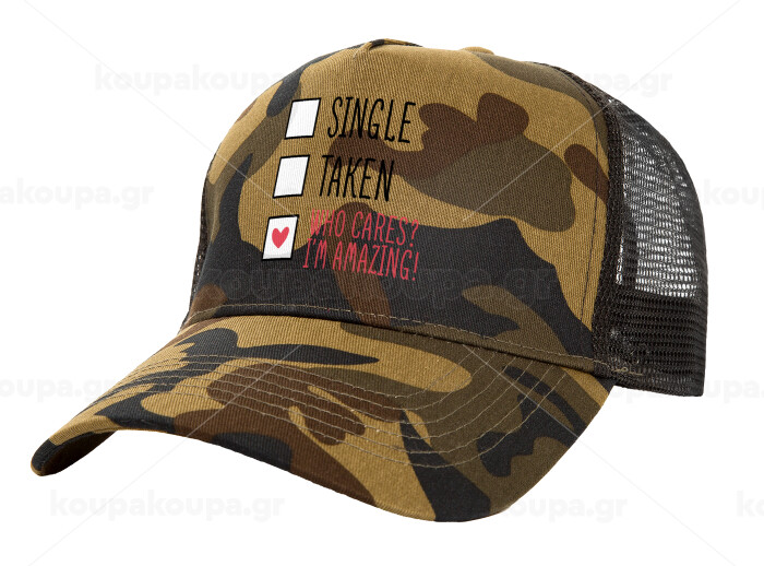 Single, Taken, Who cares i'm amazing, Καπέλο Ενηλίκων Structured Trucker, με Δίχτυ, (παραλλαγή) Army (100% ΒΑΜΒΑΚΕΡΟ, ΕΝΗΛΙΚΩΝ, UNISEX, ONE SIZE)