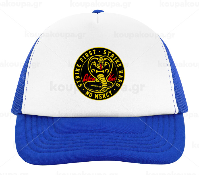 cobra kai strike first dojo, Καπέλο Ενηλίκων Soft Trucker με Δίχτυ Blue/White (POLYESTER, ΕΝΗΛΙΚΩΝ, UNISEX, ONE SIZE)