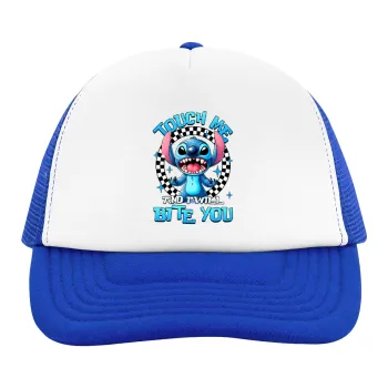 Stitch Touch Me And I Will Bite You, Καπέλο Ενηλίκων Soft Trucker με Δίχτυ Blue/White (POLYESTER, ΕΝΗΛΙΚΩΝ, UNISEX, ONE SIZE)
