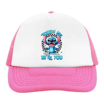 Stitch Touch Me And I Will Bite You, Καπέλο Ενηλίκων Soft Trucker με Δίχτυ Pink/White (POLYESTER, ΕΝΗΛΙΚΩΝ, UNISEX, ONE SIZE)