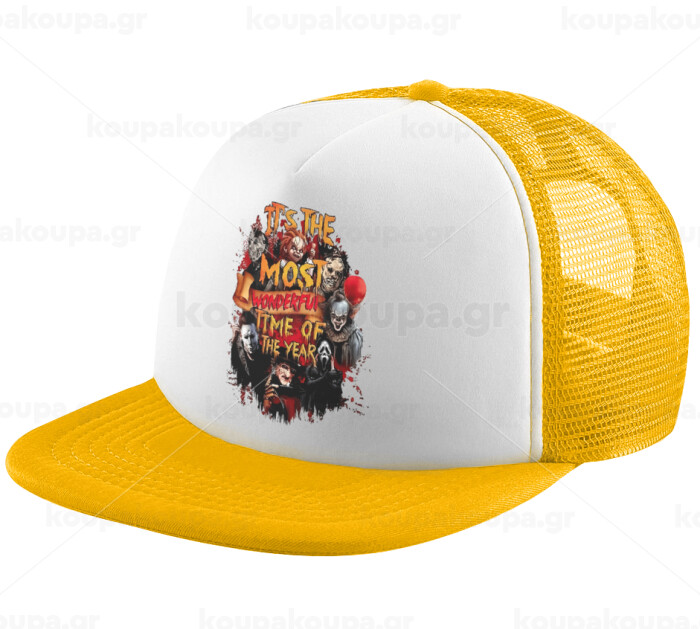 Halloween it's most wonderful time of the year, Καπέλο Ενηλίκων Soft Trucker με Δίχτυ Κίτρινο/White (POLYESTER, ΕΝΗΛΙΚΩΝ, UNISEX, ONE SIZE)