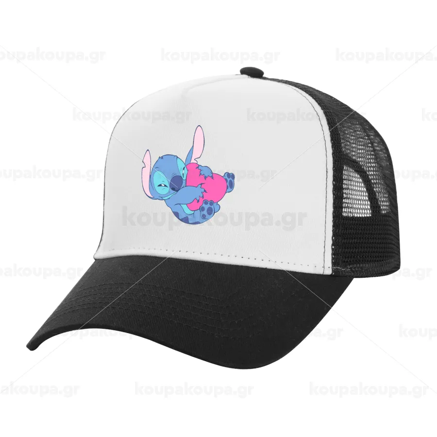 Lilo & Stitch hugs and hearts, Καπέλο Ενηλίκων Structured Trucker, με Δίχτυ, ΛΕΥΚΟ/ΜΑΥΡΟ (100% ΒΑΜΒΑΚΕΡΟ, ΕΝΗΛΙΚΩΝ, UNISEX, ONE SIZE)