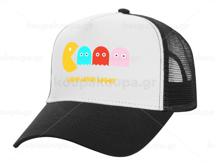 Pacman waka waka waka, Καπέλο Ενηλίκων Structured Trucker, με Δίχτυ, ΛΕΥΚΟ/ΜΑΥΡΟ (100% ΒΑΜΒΑΚΕΡΟ, ΕΝΗΛΙΚΩΝ, UNISEX, ONE SIZE)