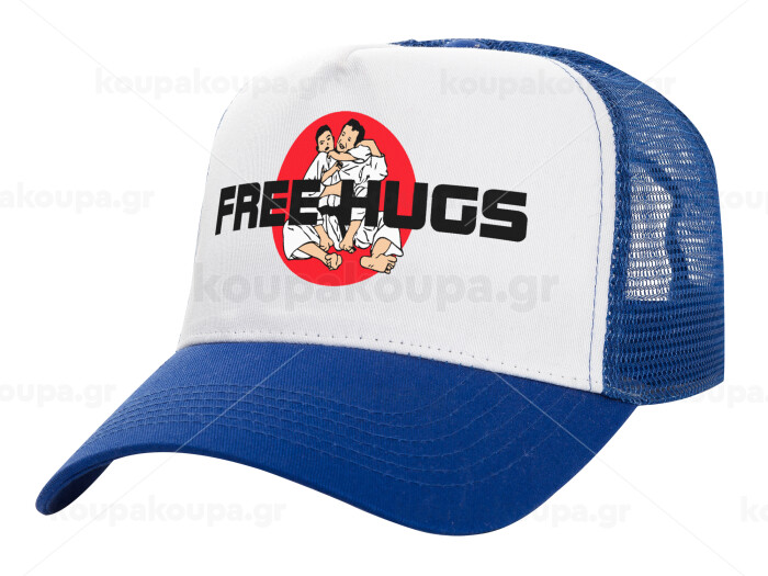 JUDO free hugs, Καπέλο Ενηλίκων Structured Trucker, με Δίχτυ, ΛΕΥΚΟ/ΜΠΛΕ (100% ΒΑΜΒΑΚΕΡΟ, ΕΝΗΛΙΚΩΝ, UNISEX, ONE SIZE)