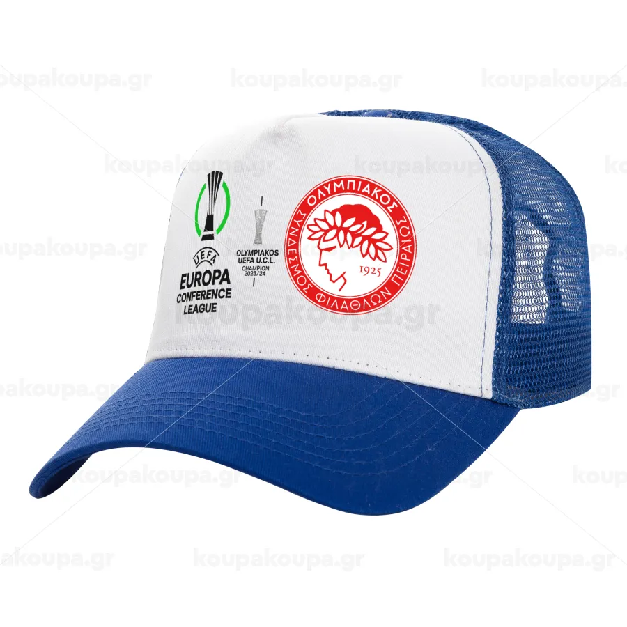 Ολυμπιακός νικητής UEFA Europa Conference League Champion 2023/24, Καπέλο Ενηλίκων Structured Trucker, με Δίχτυ, ΛΕΥΚΟ/ΜΠΛΕ (100% ΒΑΜΒΑΚΕΡΟ, ΕΝΗΛΙΚΩΝ, UNISEX, ONE SIZE)