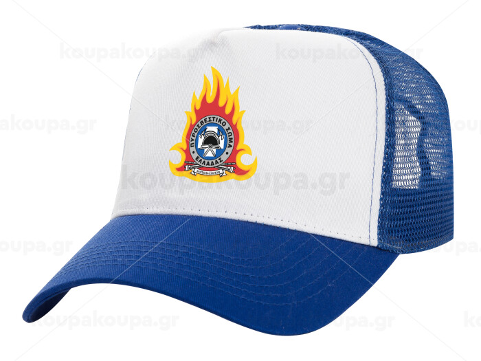 Πυροσβεστικό σώμα Ελλάδος σκούρο, Καπέλο Ενηλίκων Structured Trucker, με Δίχτυ, ΛΕΥΚΟ/ΜΠΛΕ (100% ΒΑΜΒΑΚΕΡΟ, ΕΝΗΛΙΚΩΝ, UNISEX, ONE SIZE)
