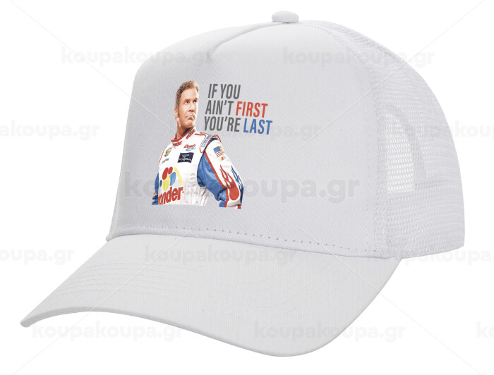 If You Ain't First You're Last Ricky Bobby, Talladega Nights, Καπέλο Ενηλίκων Structured Trucker, με Δίχτυ, ΛΕΥΚΟ (100% ΒΑΜΒΑΚΕΡΟ, ΕΝΗΛΙΚΩΝ, UNISEX, ONE SIZE)