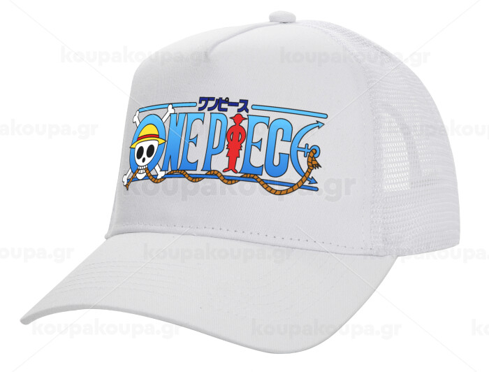 Onepiece logo, Καπέλο Ενηλίκων Structured Trucker, με Δίχτυ, ΛΕΥΚΟ (100% ΒΑΜΒΑΚΕΡΟ, ΕΝΗΛΙΚΩΝ, UNISEX, ONE SIZE)