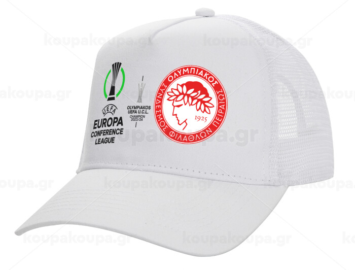 Ολυμπιακός νικητής UEFA Europa Conference League Champion 2023/24, Καπέλο Ενηλίκων Structured Trucker, με Δίχτυ, ΛΕΥΚΟ (100% ΒΑΜΒΑΚΕΡΟ, ΕΝΗΛΙΚΩΝ, UNISEX, ONE SIZE)