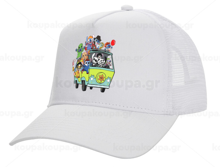 Stitch Halloween scooby car, Καπέλο Ενηλίκων Structured Trucker, με Δίχτυ, ΛΕΥΚΟ (100% ΒΑΜΒΑΚΕΡΟ, ΕΝΗΛΙΚΩΝ, UNISEX, ONE SIZE)