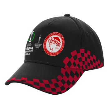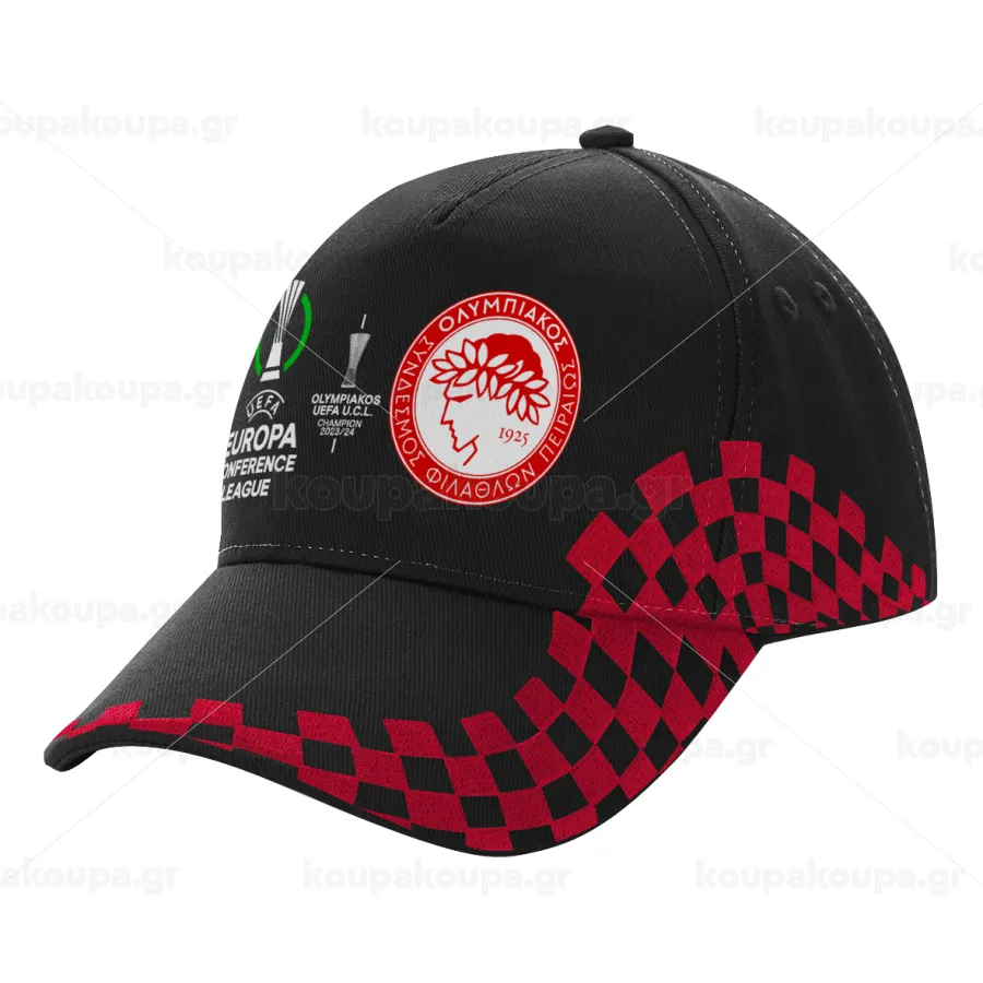 Ολυμπιακός νικητής UEFA Europa Conference League Champion 2023/24, Καπέλο Ενηλίκων Ultimate ΜΑΥΡΟ/ΚΟΚΚΙΝΟ RACING, (100% ΒΑΜΒΑΚΕΡΟ DRILL, ΕΝΗΛΙΚΩΝ, UNISEX, ONE SIZE)