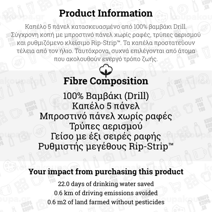Καπέλο 5 πάνελ κατασκευασμένο από 100% βαμβάκι Drill. Σύγχρονη κοπή με μπροστινό πάνελ χωρίς ραφές, τρύπες αερισμού και ρυθμιζόμενο κλείσιμο Rip-Strip™. Τα καπέλα προστατεύουν τέλεια από τον ήλιο. Ταυτόχρονα, συχνά επιλέγονται από άτομα που ακολουθούν ενεργό τρόπο ζωής.