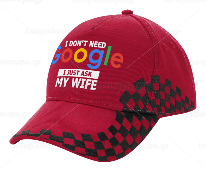 I don't need Google, just ask my WIFE, Καπέλο Ενηλίκων Ultimate ΚΟΚΚΙΝΟ/ΜΑΥΡΟ RACING με Σκρατς, (100% ΒΑΜΒΑΚΕΡΟ DRILL, ΕΝΗΛΙΚΩΝ, UNISEX, ONE SIZE)