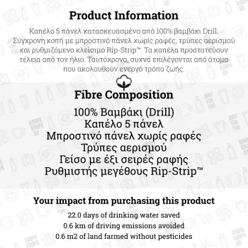 Καπέλο 5 πάνελ κατασκευασμένο από 100% βαμβάκι Drill. Σύγχρονη κοπή με μπροστινό πάνελ χωρίς ραφές, τρύπες αερισμού και ρυθμιζόμενο κλείσιμο Rip-Strip™. Τα καπέλα προστατεύουν τέλεια από τον ήλιο. Ταυτόχρονα, συχνά επιλέγονται από άτομα που ακολουθούν ενεργό τρόπο ζωής.