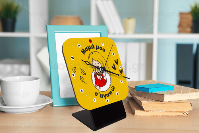 Μανούλα σ'αγαπώ αγκαλιά!, Επιτραπέζιο ρολόι ξύλινο με δείκτες (10cm)