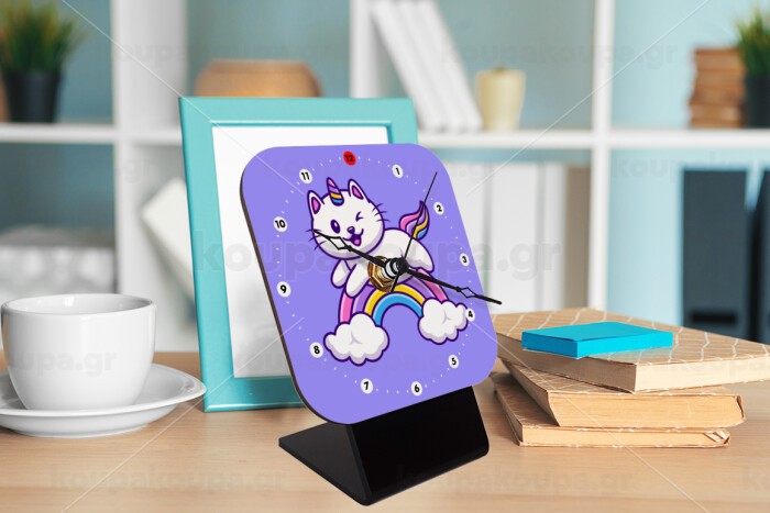 Cute cat unicorn, Επιτραπέζιο ρολόι ξύλινο με δείκτες (10cm)