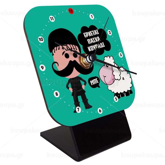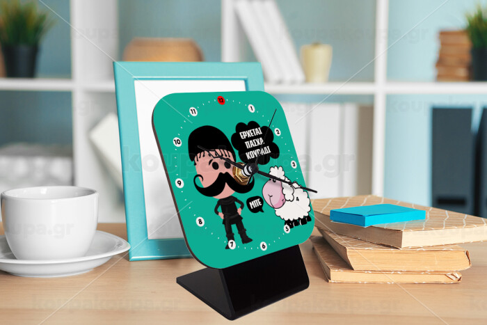 Κρητικός "Έρχεται Πάσχα κουράδι", Επιτραπέζιο ρολόι ξύλινο με δείκτες (10cm)